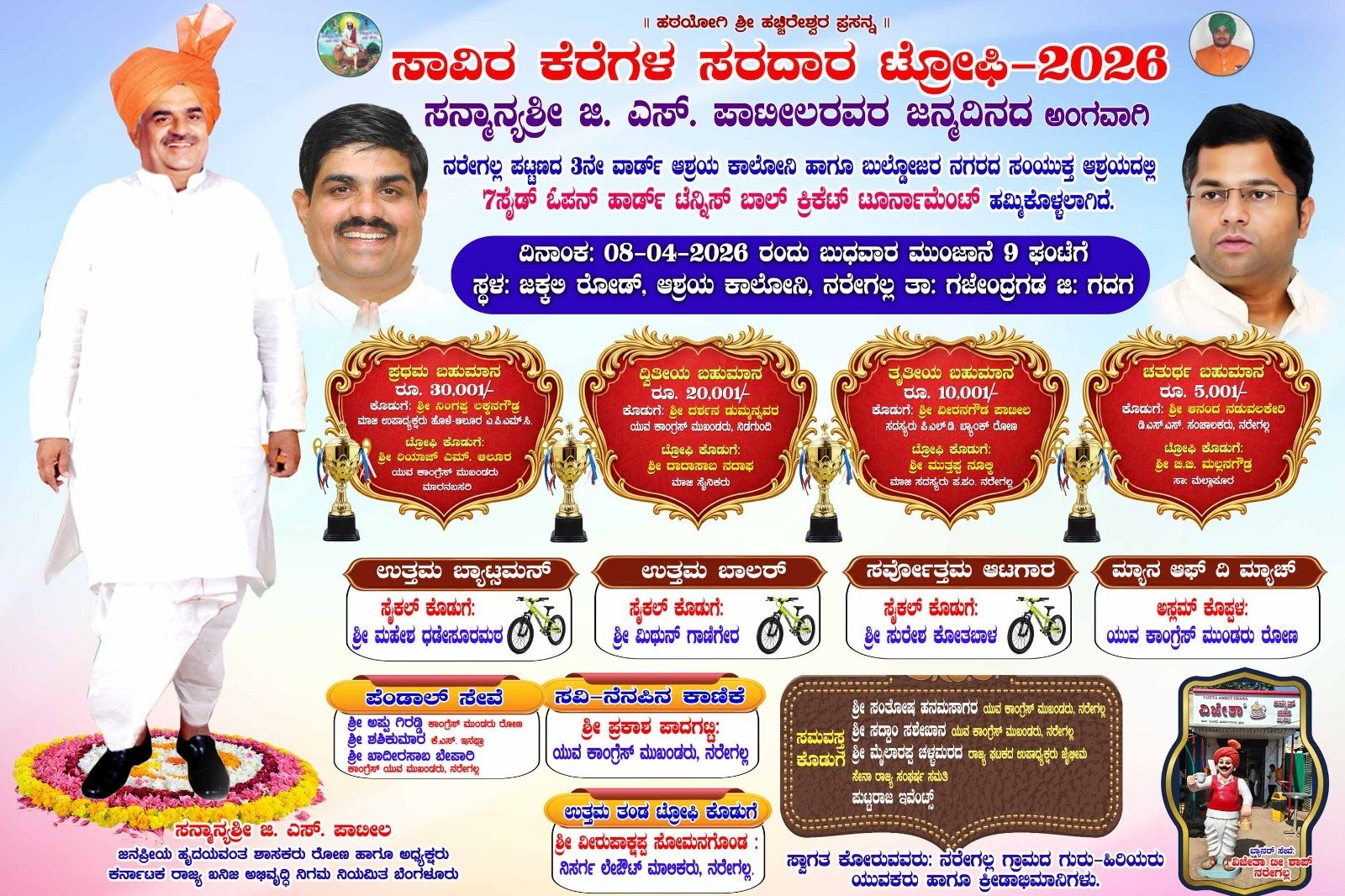 ನರೇಗಲ್: ಪಟ್ಟಣದ 3ನೇ ವಾರ್ಡ್ನ ಆಶ್ರಯ ಕಾಲೋನಿ ಹಾಗೂ ಬುಲ್ಡೋಜರ್ ನಗರದ ನಿವಾಸಿಗಳ ಆಶ್ರಯದಲ್ಲಿ ರೋಣ ಮತಕ್ಷೇತ್ರದ ಶಾಸಕರಾದ ಜಿ. ಎಸ್. ಪಾಟೀಲ ಅವರ ಜನ್ಮ ದಿನದ ಪ್ರಯುಕ್ತ ʼಸಾವಿರ ಕೆರೆಗಳ ಸರದಾರ ಟ್ರೋಫಿʼ ಎನ್ನುವ 7 ಸೈಡ್ ಓಪನ್ ಹಾರ್ಡ್ ಟೆನ್ನಿಸ್ ಬಾಲ್ ಕ್ರಿಕೇಟ್ ಪಂದ್ಯಾವಳಿಯನ್ನು ಎಪ್ರಿಲ್ 8 ರಿಂದ ಆಯೋಜಿಸಲಾಗಿದೆ ಎಂದು ಆಯೋಜಕ ತಂಡದ ಸದ್ದಾಂ ನಶೇಖಾನ್ ಮಾಹಿತಿ ನೀಡಿದರು.