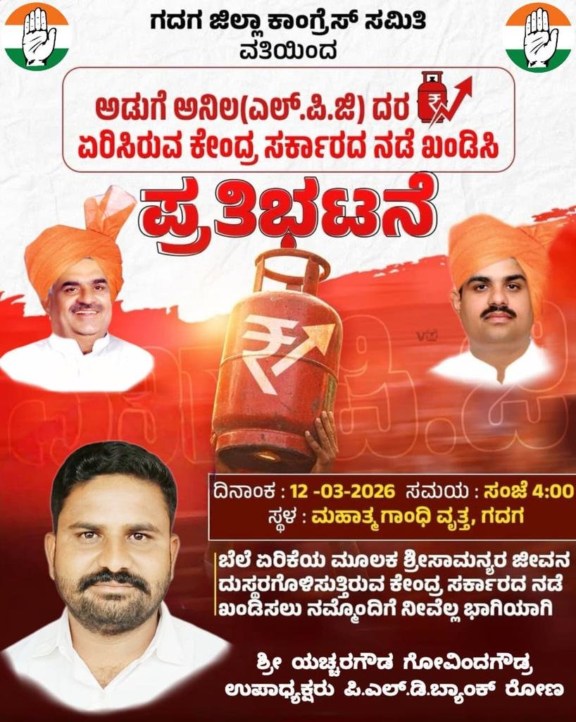 ಪ್ರತಿಭಟನೆ ಹಮ್ಮಿಕೊಂಡಿದ್ದು ಕಾಂಗ್ರೆಸ್ ಪಕ್ಷದ ಮುಖಂಡರು, ಕಾರ್ಯಕರ್ತರು, ಹಿತೈಷಿಗಳು ಹೆಚ್ಚಿನ ಸಂಖ್ಯೆಯಲ್ಲಿ ಪಾಲ್ಗೊಂಡು ಯಶಸ್ವಿಗೊಳಿಸಲು ಪಿ. ಎಲ್. ಡಿ ಬ್ಯಾಂಕ್ ಉಪಾಧ್ಯಕ್ಷ ಯಚ್ಚರಗೌಡ ಗೋವಿಂದಗೌಡ್ರ ವಿನಂತಿಸಿದರು